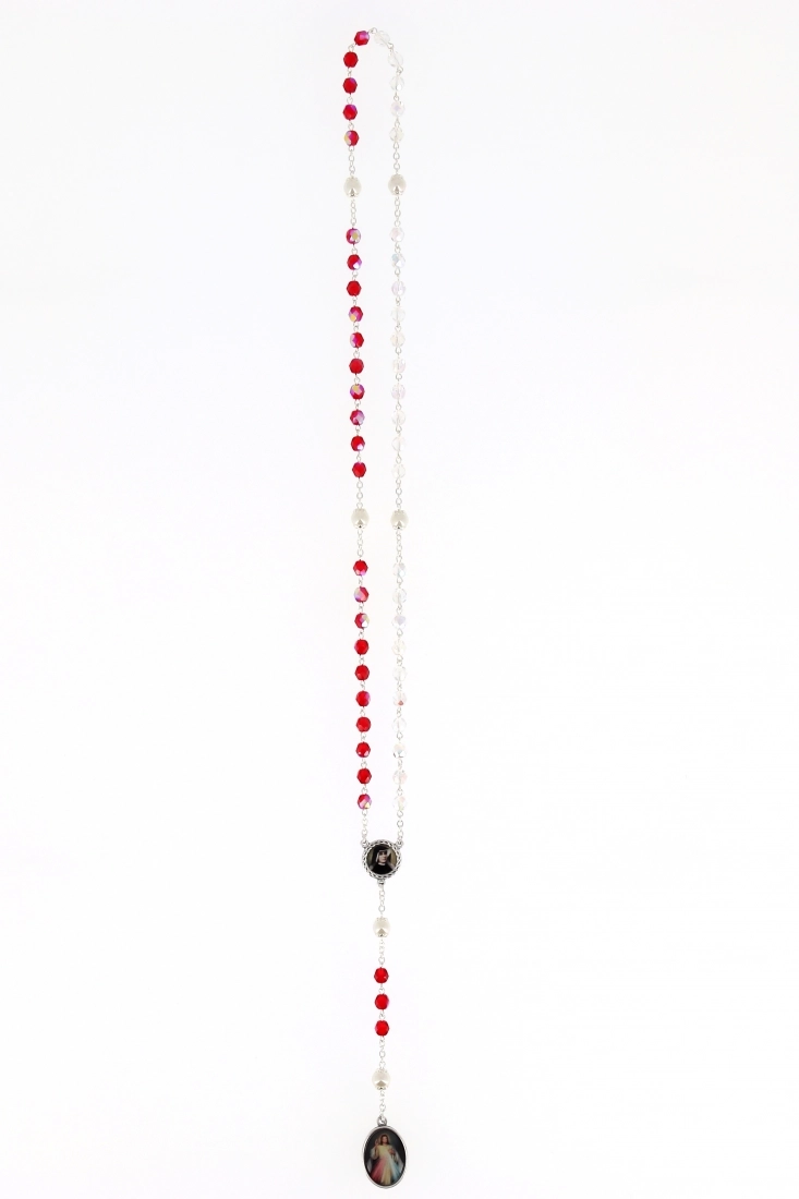 La corona è composta da 5 poste di 10 grani, di diametro 6 mm, in cristallo rosso e bianco, che sono i colori tipici della devozione alla Divina Misericordia. La crociera raffigura Santa Faustina Kowalska, mistica e veggente, venerata in tutto il mondo come la “segretaria della divina misericordia”. Sulla medaglia finale è raffigurata l'immagine di Gesù Confido in Te. La corona è facilmente indossabile al collo. Questa devozione intende riportare al centro il tema della divina misericordia: «Solo nella misericordia di Dio il mondo troverà la pace e l’uomo la felicità!» (Giovanni Paolo II).