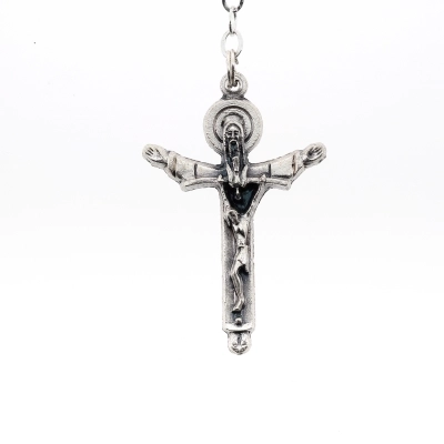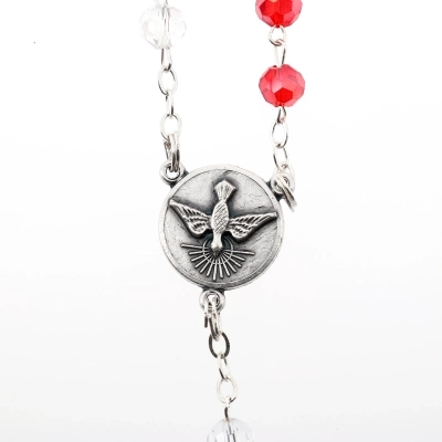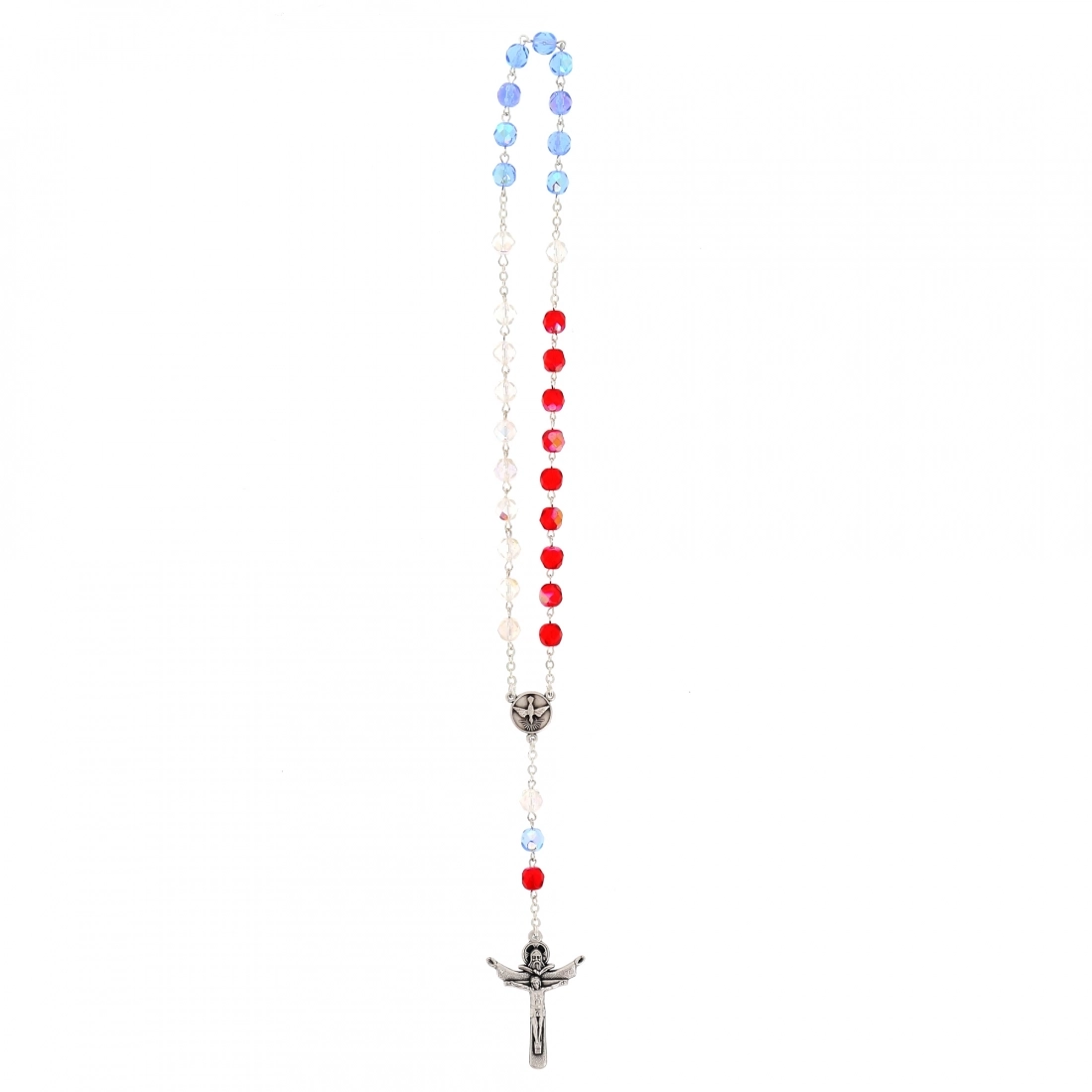 La corona è composta da 3 poste di 9 grani, di diametro 6 mm, in cristallo bianco, rosso e celeste. La crociera raffigura lo Spirito Santo e la croce finale è molto particolare in quanto viene raffigurata la Trinità. Questa preghiera è una delle più belle in onore della santissima Trinità, un'eco solenne del "Santo, Santo, Santo" che cantano in cielo gli Angeli e i Santi, canto di lode e gloria alla santa Trinità.