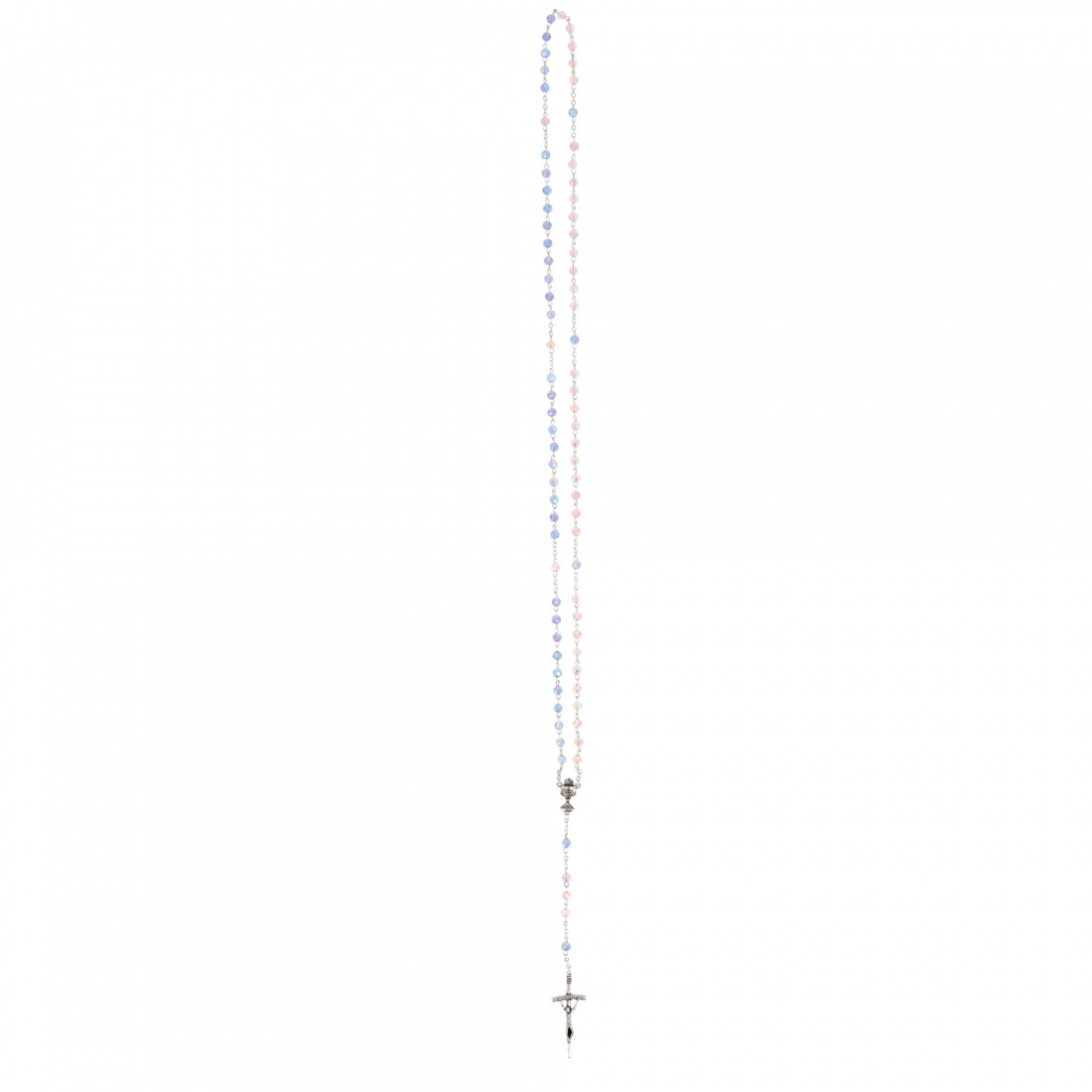 La corona è composta da 7 poste di 10 grani, di diametro 4 mm, in cristallo rosa e celeste. La crociera raffigura un Calice e la croce finale è una classica croce pastorale. La corona è facilmente indossabile al collo. Da pregare con la speranza che il Signore, possa intervenire ancora oggi per donare la maternità e la paternità alle coppie che attendono di diventare genitori e che faticano a vedere realizzato il proprio desiderio d’amore.