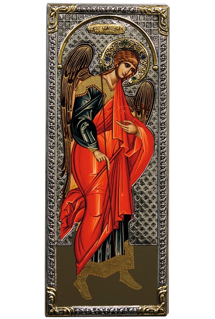 Icona bizantina, in legno, raffigurante San Michele Arcangelo, realizzata in argento 925 e doratura 22K. Si adatta per essere collocata in qualsiasi ambiente domestico e con qualsiasi stile di arredamento. Ideate e prodotte esclusivamente in Grecia, da un'importantissima azienda che da anni opera nel settore delle icone sacre e che lavora con prodotti di alta qualità.