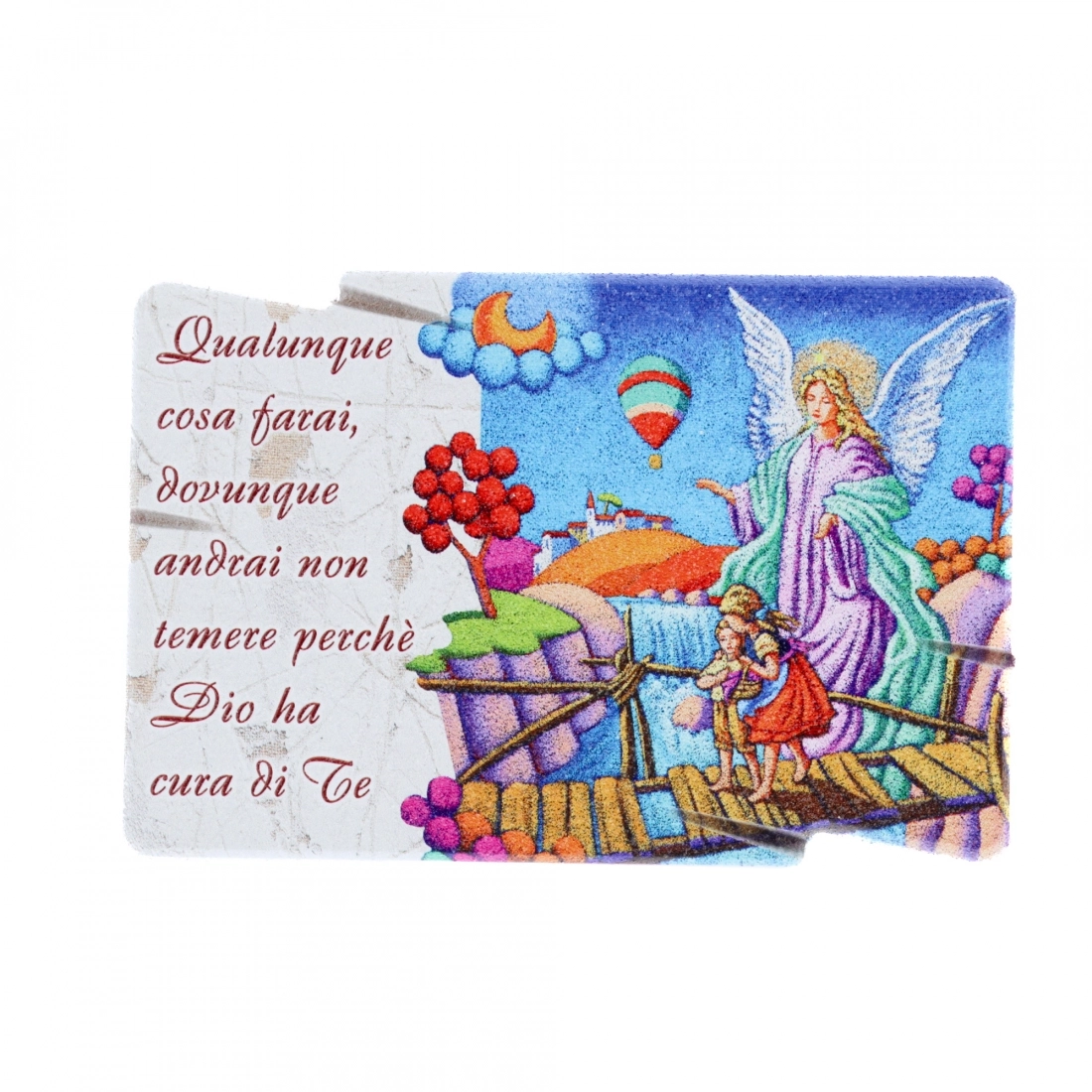 Bel quadretto in legno con basetta per appoggio e forellino per essere appeso, delle dimensioni 10x15 cm. Viene raffigurato l'Angelo custode che veglia su due bambini e una preghiera dedicata: "Qualunque cosa farai, ovunque andrai non temere perchè Dio ha cura di Te". L'illustrazione è ad opera del pittore maceratese Stefano Calisti, conosciuto come il "prestigiatore dei colori". La sua pittura è infatti caratterizzata da una cromia straordinariamente vivace e ha subito goduto di notevoli consensi di pubblico e di critica. Tra i soggetti preferiti, il paesaggio, e di esso la suggestione evocatrice del colore, della materia e di una luce che si fa accezione e poesia. Ideale da regalare in occasione di un Battesimo o una prima Comunione.