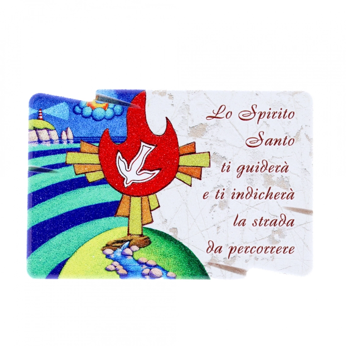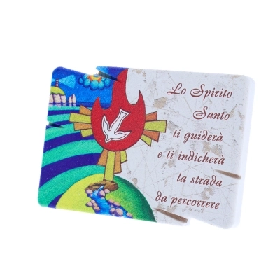 Bel quadretto in legno con basetta per appoggio e forellino per essere appeso, delle dimensioni 10x15 cm. Viene raffigurata l'immagine dello Spirito Santo, simbolo della Cresima e l'augurio: "Lo Spirito Santo ti guiderà e ti indicherà la strada da percorrere". L'illustrazione è ad opera del pittore maceratese Stefano Calisti, conosciuto come il "prestigiatore dei colori". La sua pittura è infatti caratterizzata da una cromia straordinariamente vivace e ha subito goduto di notevoli consensi di pubblico e di critica. Tra i soggetti preferiti, il paesaggio, e di esso la suggestione evocatrice del colore, della materia e di una luce che si fa accezione e poesia. Ideale da regalare per la Cresima o da usare come bomboniera per festeggiare questo Sacramento.
