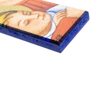 Bel quadretto in legno con forellino per essere appeso, delle dimensioni 4x15 cm. Viene raffigurata la Madonna con Bambino. L'illustrazione è ad opera del pittore maceratese Stefano Calisti, conosciuto come il "prestigiatore dei colori". La sua pittura, è infatti caratterizzata da una cromia straordinariamente vivace e ha subito goduto di notevoli consensi di pubblico e di critica. Tra i soggetti preferiti, il paesaggio, e di esso la suggestione evocatrice del colore, della materia e di una luce che si fa accezione e poesia. Bella idea regalo, per abbellire un salotto o un soggiorno.