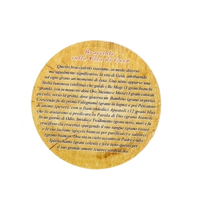 Ogni pietra sta ad indicare un momento significativo della Vità di Gesù: Una notte apparve in cielo una Stella luminosa (stellina dorata pendente) che guidò i Re Magi (3 grani cristallo bianco) con in mano i tre doni Oro, Incenso e Mirra (3 grani colorati piccoli) verso la grotta dove giaceva il Bambino (grano in perla). Crescendo, Gesù, fu dapprima falegname (grano in legno) e poi Pescatore di anime (pesce pendente), con a fianco 12 apostoli (12 grani azzurri in cristallo) che lo aiutarono a predicare la Parola di Dio (grano bianco grande). In un giorno di Odio, Invidia e Tradimento (3 grani neri), morì e fu crocifisso (croce pendente dorata), spargendo il suo sangue (grano rosso) e le sue lacrime (grano pendente a forma di lacrima) per purificarci e salvarci (grano bianco). Ora sta in Cielo accanto al Padre e allo Spirito Santo (grani celesti) e fece tutto questo per il suo grande amore (cuore) verso di noi.