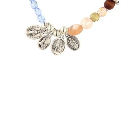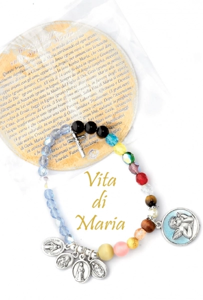 Carinissimo bracciale elastico, realizzato con pietre di diverse dimensioni, colori e materiali che illustra la vita di Maria. Un regalo bellissimo da donare in qualsiasi occasione, che unisce tendenza e spiritualità.
