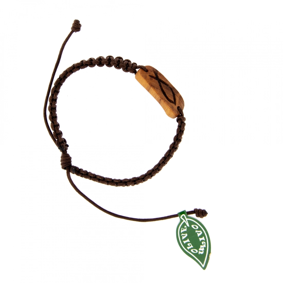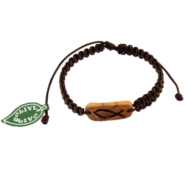 Bel bracciale in corda marrone intrecciata, con placca in legno d'ulivo con incisa la figura del pesce stilizzata. Questo bracciale è regolabile e adattabile comodamente a qualsiasi tipo di polso. Realizzato con materiali di alta qualità e con una lavorazione molto accurata.