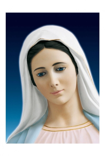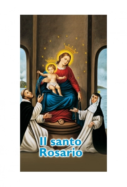 Biglietto a cinque ante con bellissima immagine della Madonna di Pompei. All'interno è presente la spiegazione su come si recita il santo Rosario, completo di tutti i misteri e le Litanie alla Beata Vergine Maria. Il formato chiuso del biglietto è 7,5x13,4 cm.