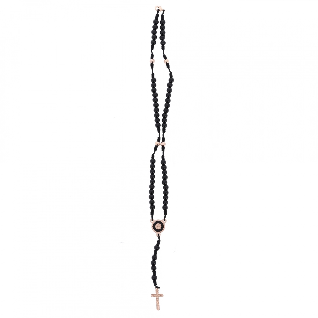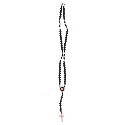 Bellissima corona in corda nera con grani in legno nero di diametro 6 mm, intervallati da Pater in metallo, con finitura color rosè. Per rendere tutta la corona più elegante e raffinata, anche la croce e la crociera sono in metallo color rosè. La corona è indossabile, grazie al gancetto che ne consente l'apertura. Ideale come regalo da donare in qualsiasi occasione. Fornita in bustina trasparente con santino della Madonna Miracolosa.