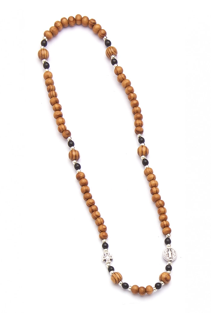 Bellissima corona del Rosario con grani in legno da 6 mm, i grani in cui si recita il "Padre Nostro" sono in legno dello stesso colore degli altri ma di diametro 8 mm e la corona presenta una crocetta e una medaglia di san Benedetto dal diametro di 10 mm, per questo la corona viene definita di san Benedetto. Tutto è montato su un elastico molto resistente e che rende la corona molto versatile e indossabile in vari modi, infatti può essere indossata come collana, facendola passare dalla testa, oppure come bracciale facendole fare un doppio giro.