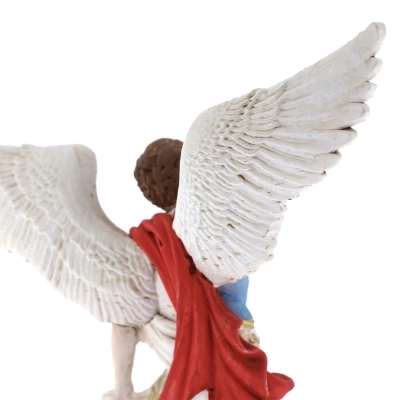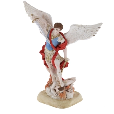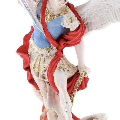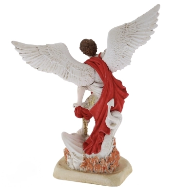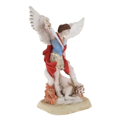 Carinissima statua, dall'altezza di 15 cm, realizzata in resina e dipinta con estrema cura dei dettagli e nelle sfumature di colore. La statua, realizzata interamente in resina colorata, rappresenta San Michele Arcangelo, con le ali aperte e nell'atto di uccidere Satana. Da regalare o regalarsi, a protezione della casa dal male. Realizzata in Italia.
