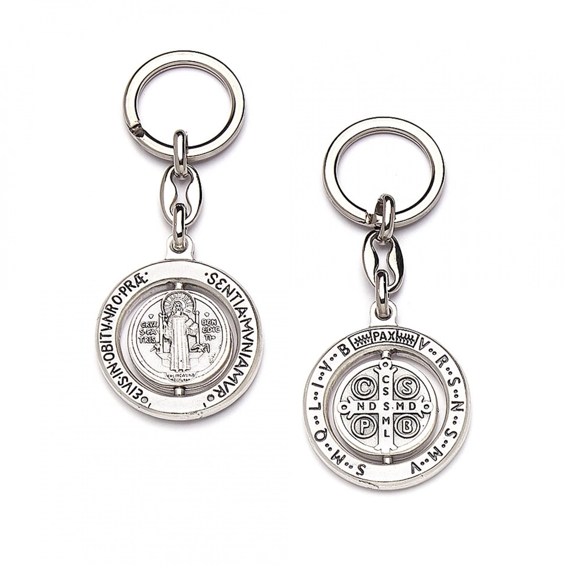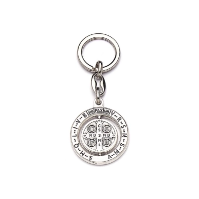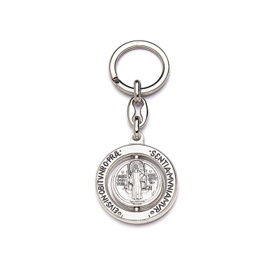Bel portachiavi in metallo, con medaglia di San Benedetto girevole del diametro di 4 cm e altezza complessiva 9 cm. L'anello per le chiavi ha un diameto di 3 cm. Prodotto realizzato in Italia.