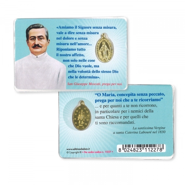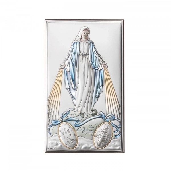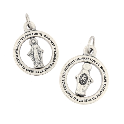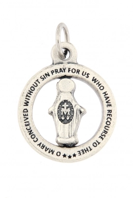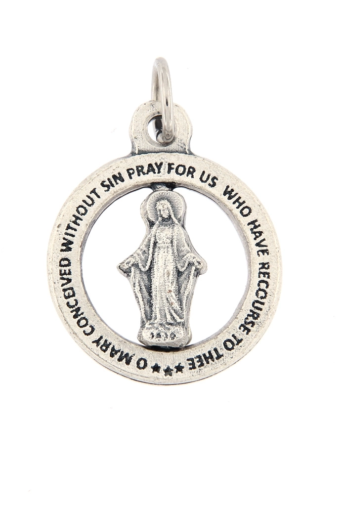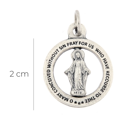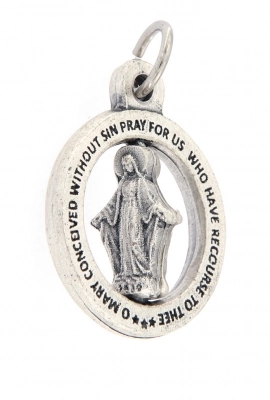 Particolarissima Medaglia Miracolosa, dal diametro di 2 cm, realizzata in metallo, con all'interno la sagoma rotante della Madonna. Nella parte esterna della medaglia è riportata la scritta in lingua inglese "O Mary conceived without sin, pray for us who have recourse to thee". La medaglia è dotata di anellino per poter essere appesa ad una catenina ed indossata al collo (catenina non inclusa). Realizzata in Italia.