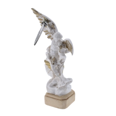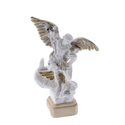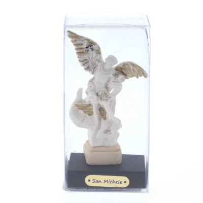 Carinissima statua, dall'altezza di 7 cm, realizzata in resina con dettagli in oro, dipinti a mano con estrema cura. La statua, realizzata interamente in resina colorata, rappresenta San Michele Arcangelo, con le ali aperte e nell'atto di uccidere Satana. Da regalare o regalarsi, a protezione della casa dal male. Realizzata in Italia.