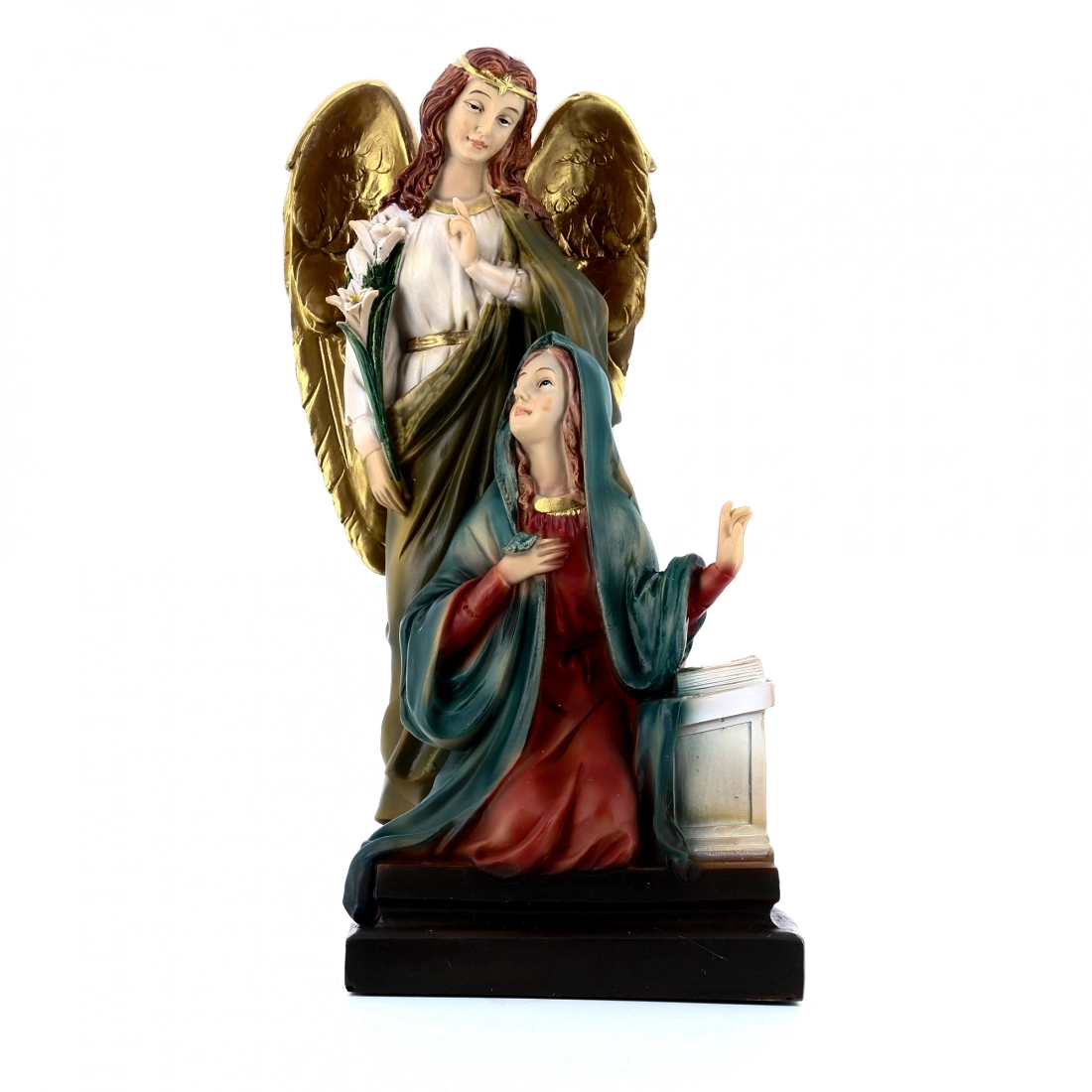 Graziosa e dettagliata statua che raffigura il momento dell'Annunciazione. La statua, dai colori brillanti, poggia su una solida base ed è adatta da esporre sia in qualsiasi ambiente domestico. Questa rappresentazione raffigura l'Arcangelo Gabriele, nel momento in cui annuncia a Maria che darà alla luce, per opera dello Spirito Santo, un bambino e che lo chiamerà Gesù. L'Annunciazione viene celebrata il 25 marzo.