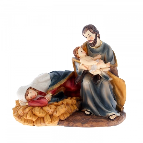 Bellissima ed originale raffigurazione, in resina, dalle dimensioni di h. 16 x 18,5 x 12,5 cm, della Natività con la Madonna sdraiata in atteggiamento di riposo e San Giuseppe che tiene in braccio Gesù Bambino appena nato. Ideale come dono per le festività natalizie, ma anche da acquistare per arricchire e dare un tocco di originalità al proprio presepe. La statua è fornita in scatola con apposito imballo.