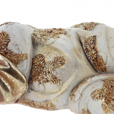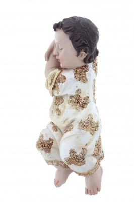 Bellissima e originale statua di Gesù Bambino dormiente, raffigurato con una veste decorata in oro. Ricca di dettagli ben rifiniti e curata nei particolari, la statua è adatta per essere esposta in qualsiasi ambiente domestico, ma anche in luoghi di culto. Adatta come idea regalo da donare in qualsiasi momento e per qualsiasi occasione, ma si arricchisce di valore spirituale soprattutto se regalata nel periodo natalizio.