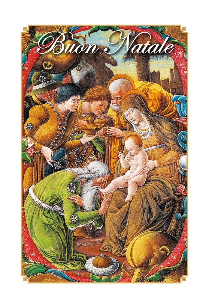 Biglietto per accompagnare i tuoi auguri natalizi, con l'adorazione dei Magi di G. da Cremona. Questa tavola è un’autentica festa per gli occhi, che trasmette una sensazione di gioiosa esultanza. I re Magi sono raffigurati nell'atto di consegnare i loro doni al Bambino.