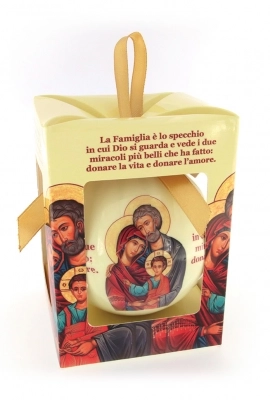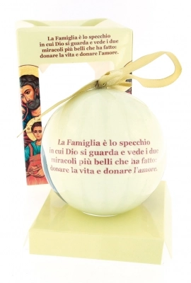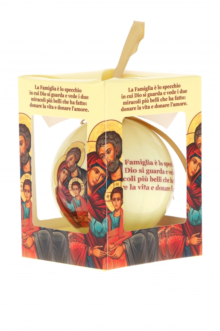 Pallina di Natale, dal diametro di 7,5 cm, in plastica piena stampata, con raffigurazione icona Sacra Famiglia e frase incisa. Fornita in una elegante confezione dalle dimensioni di 10,5x8 cm. Carinissima idea regalo da donare sotto le festività natalizie o da acquistare per arricchire il proprio albero di Natale con soggetti sacri.
