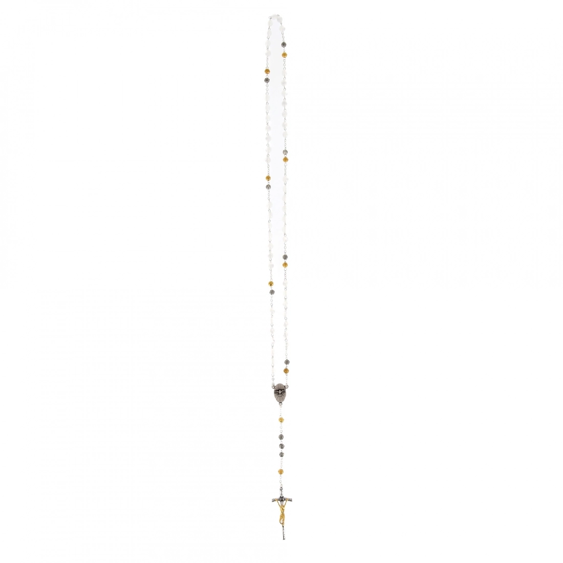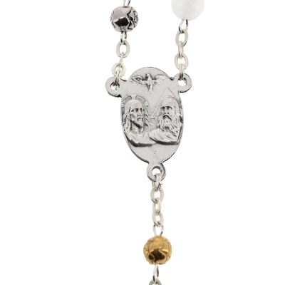 La corona è composta da 7 poste di 7 grani, di diametro 8 mm, in madreperla bianchi, intervallati da due grani in metallo a forma di rosellina. La crociera raffigura lo Spirito Santo e come croce finale c'è una semplicissima croce pastorale. Con questa coroncina ci avviciniamo al mistero dello Spirito Santo e capiamo quanto è forte e importante la sua azione nella vita di ciascuno.