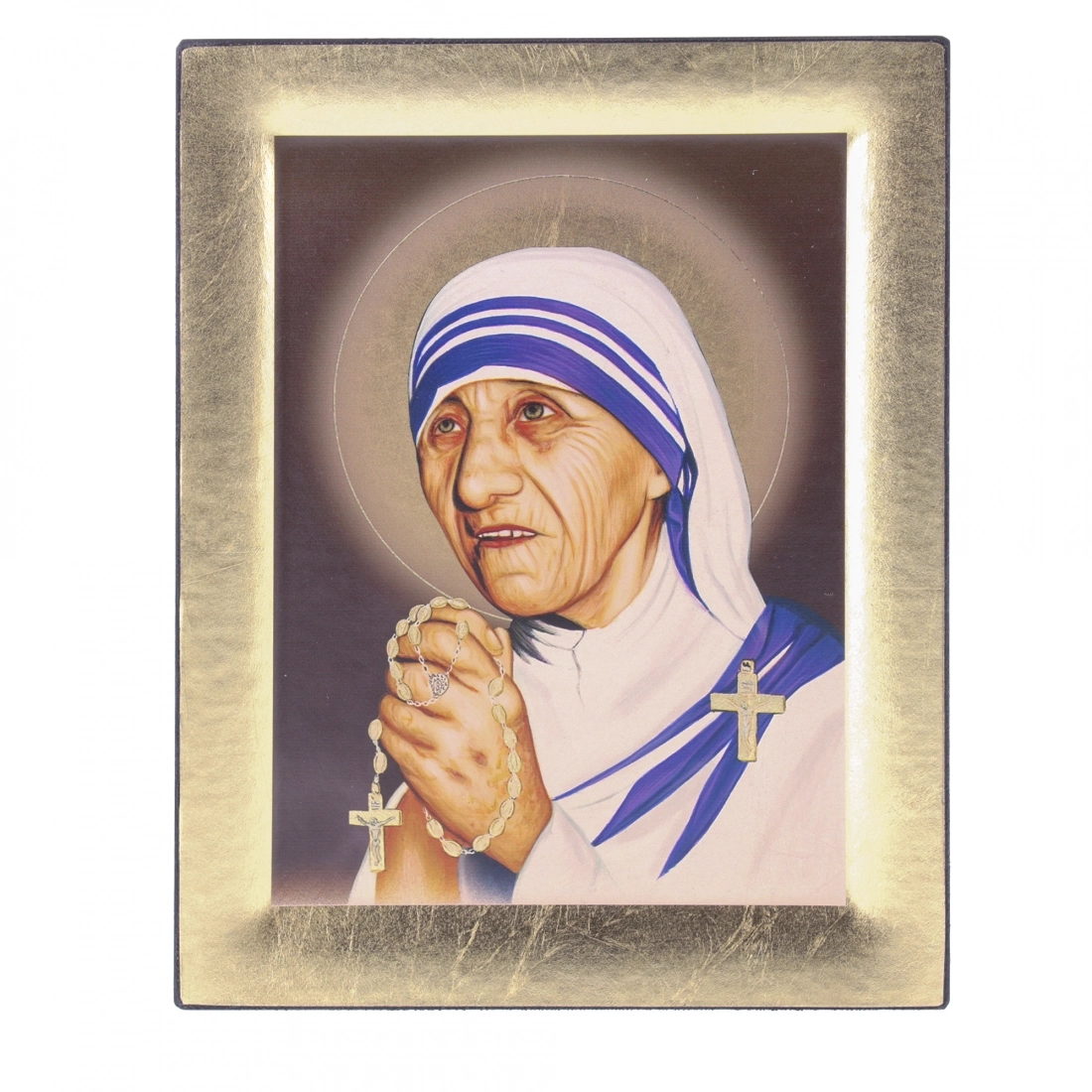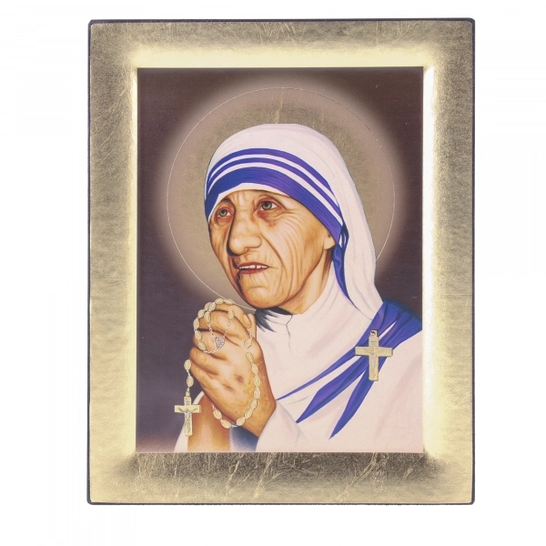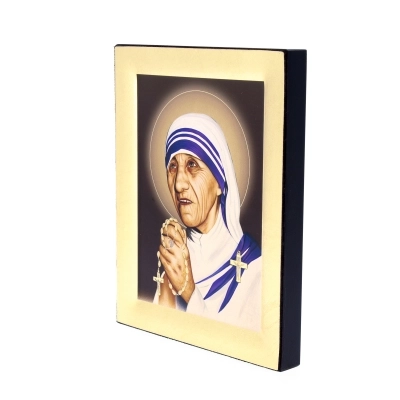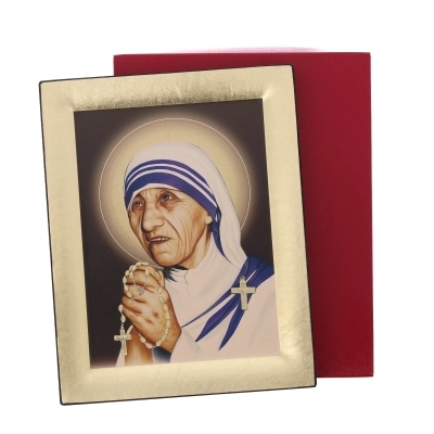 Icona bizantina, in legno, raffigurante madre Teresa di Calcutta, realizzata in foglia oro. Dai colori vivaci e dalla raffigurazione originale, si adatta per essere collocata in qualsiasi ambiente domestico e con qualsiasi stile di arredamento. Ideate e prodotte esclusivamente in Grecia, da un'importantissima azienda che da anni opera nel settore delle icone sacre e che lavora con prodotti di alta qualità.