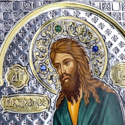 Icona bizantina, in legno, raffigurante San Giovanni Battista, realizzata in argento 925 e doratura 22K. Si adatta per essere collocata in qualsiasi ambiente domestico e con qualsiasi stile di arredamento. Ideate e prodotte esclusivamente in Grecia, da un'importantissima azienda che da anni opera nel settore delle icone sacre e che lavora con prodotti di alta qualità.