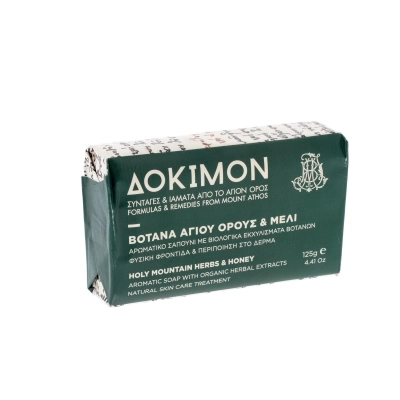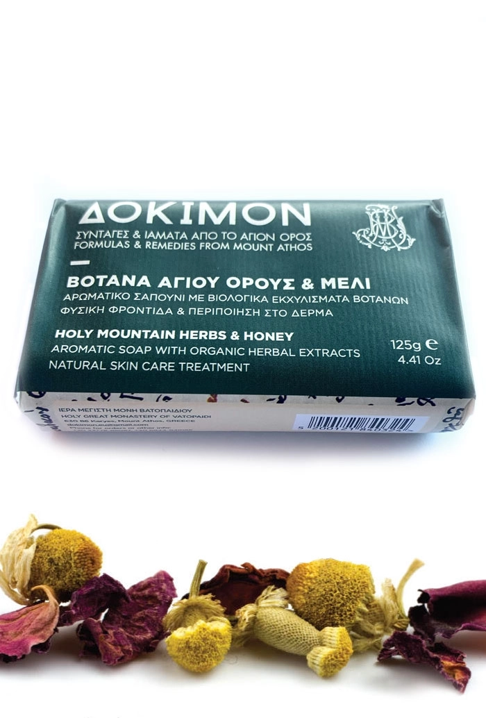 Sapone alle erbe sante di montagna e miele, prodotto dai monaci del monastero posto sul Monte Athos. Realizzato con erbe aromatiche raccolte direttamente nelle vicinanze del monastero, è un trattamento naturale per la cura della pelle, che idrata e protegge la pelle sensibile. Formule e rimedi dal Monte Athos.