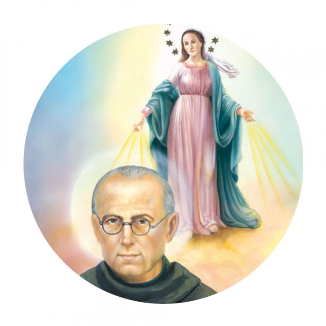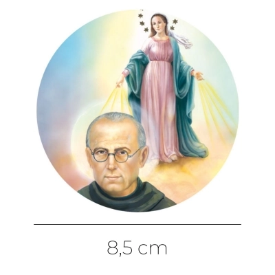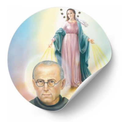 Bellissimo adesivo raffigurante San Massimiliano Kolbe e la Madonna Immacolata, del diametro di 8,5 cm. Questi adesivi sono spesso apposti su oggetti personali, veicoli, o in luoghi di preghiera come segno di devozione e protezione. Possono essere considerati come un mezzo per esprimere la propria fede e per ricordare la presenza e l'intercessione della Madonna e dei santi nella vita quotidiana.