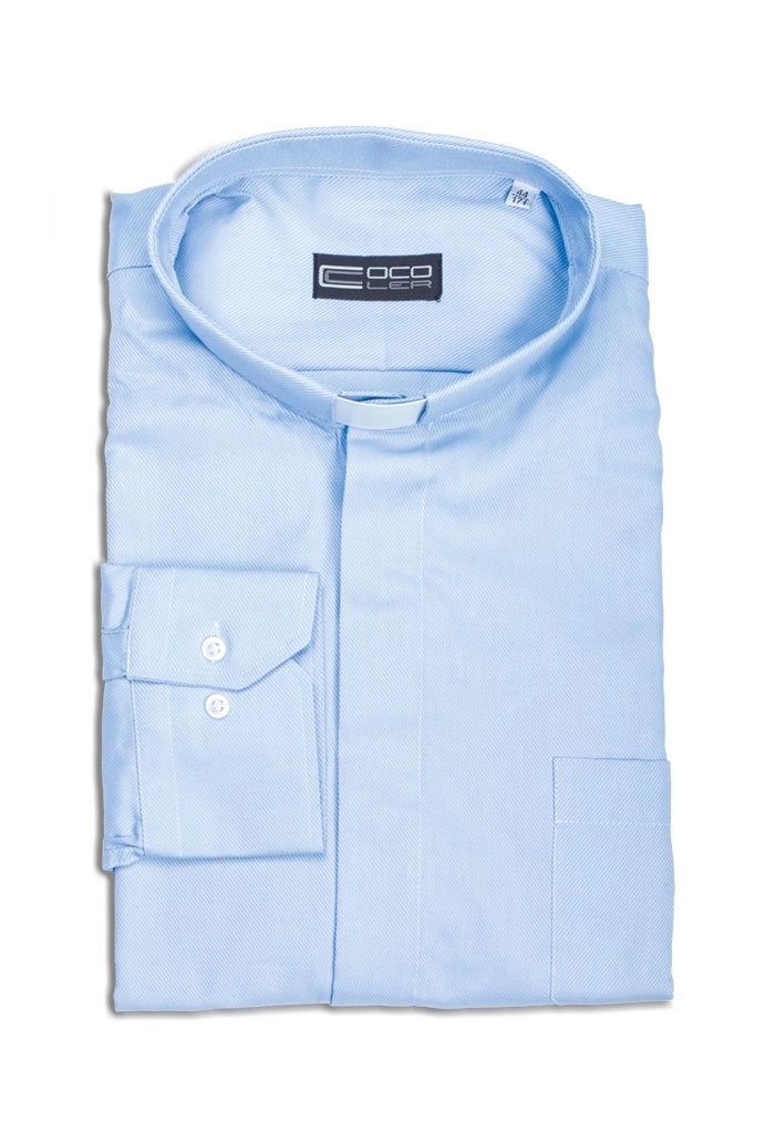 Camicia celeste con collo clergy, realizzata in cotone con una piccola percentuale di poliestere per renderla più duratura nel tempo e per facilitarne il lavaggio e la stiratura. Molto particolare la trama del tessuto in diagonale, che rende il prodotto innovativo ma soprattutto molto facile da stirare. Ha una vestibilità ottima e il tessuto garantisce comodità e freschezza. Ha un comodo taschino posto nella parte sinistra, doppio bottone sul polsino e i bottoni posti sul davanti sono coperti dal tessuto della camicia stessa. Realizzata interamente in Italia con materiali di primissima qualità e provenienti dall'Italia o paesi dell'Unione Europea, da un'azienda che cura ogni minimo dettaglio con passione e attenzione.