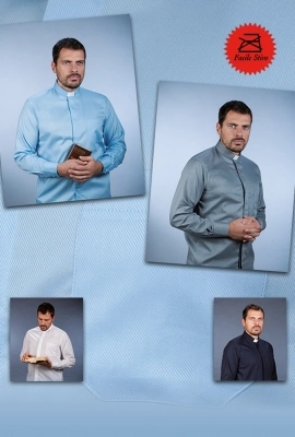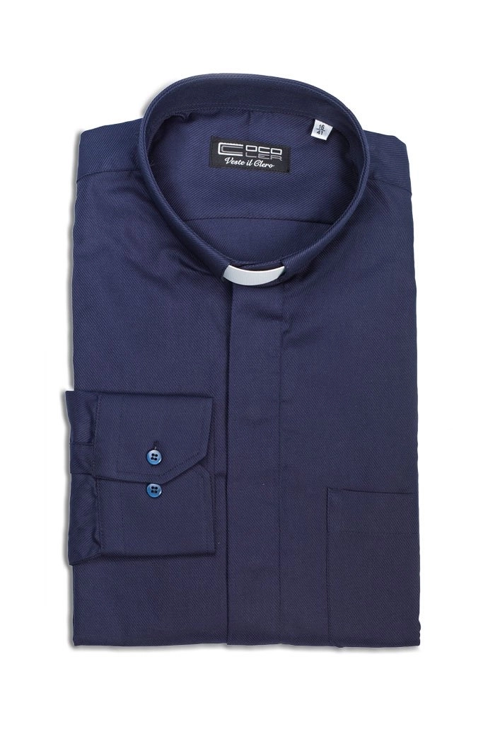 Camicia blu con collo clergy, realizzata in cotone con una piccola percentuale di poliestere per renderla più duratura nel tempo e per facilitarne il lavaggio e la stiratura. Molto particolare la trama del tessuto in diagonale, che rende il prodotto innovativo ma soprattutto molto facile da stirare. Ha una vestibilità ottima e il tessuto garantisce comodità e freschezza. Ha un comodo taschino posto nella parte sinistra, doppio bottone sul polsino e i bottoni posti sul davanti sono coperti dal tessuto della camicia stessa. Realizzata interamente in Italia con materiali di primissima qualità e provenienti dall'Italia o paesi dell'Unione Europea, da un'azienda che cura ogni minimo dettaglio con passione e attenzione.