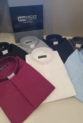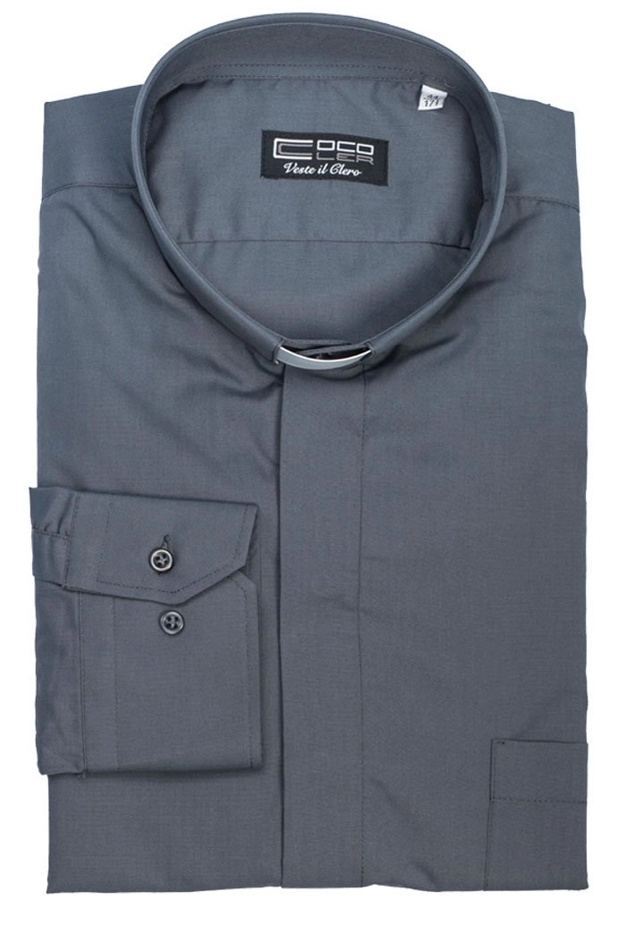 Camicia grigio scuro con collo clergy, realizzata in cotone con una piccola percentuale di poliestere per renderla più duratura nel tempo e per facilitarne il lavaggio e la stiratura. Ha una vestibilità ottima e il tessuto garantisce comodità e freschezza. Ha un comodo taschino posto nella parte sinistra, doppio bottone sul polsino e i bottoni posti sul davanti sono coperti dal tessuto della camicia stessa. Realizzata interamente in Italia con materiali di primissima qualità e provenienti dall'Italia o paesi dell'Unione Europea, da un'azienda che cura ogni minimo dettaglio con passione e attenzione.