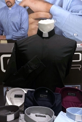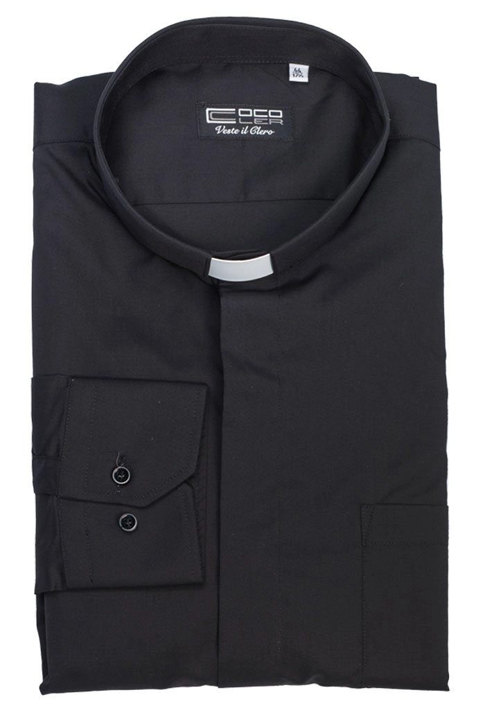 Camicia nera con collo clergy, realizzata in cotone con una piccola percentuale di poliestere per renderla più duratura nel tempo e per facilitarne il lavaggio e la stiratura. Ha una vestibilità ottima e il tessuto garantisce comodità e freschezza. Ha un comodo taschino posto nella parte sinistra, doppio bottone sul polsino e i bottoni posti sul davanti sono coperti dal tessuto della camicia stessa. Realizzata interamente in Italia con materiali di primissima qualità e provenienti dall'Italia o paesi dell'Unione Europea, da un'azienda che cura ogni minimo dettaglio con passione e attenzione.