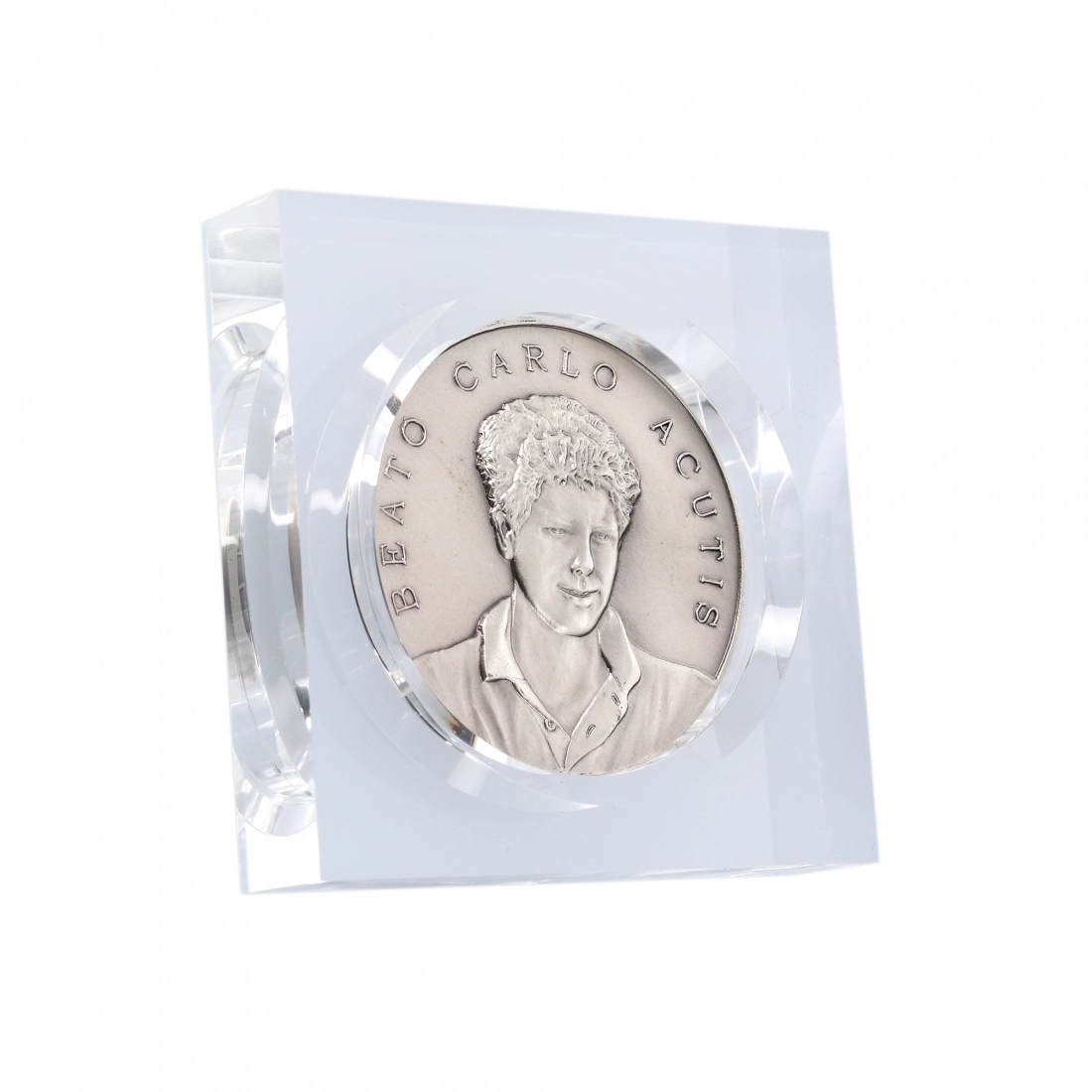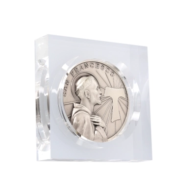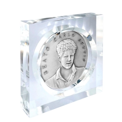 Carinissimo soprammobile in plexiglass trasparente con inserita una medaglia in ottone argentato, di diametro 6 cm, raffigurante il beato Carlo Acutis e sul retro San Francesco d'Assisi. La medaglia all'interno è estremamente dettagliata e rifinita con cura. Realizzata appositamente per Editrice Shalom, che ne ha seguito direttamente tutta la lavorazione, dalla scultura in plastilina fino alla realizzazione del primo modello. Rigorosamente ideata e prodotta in Italia da un'azienda artigianale e leader nella produzione di medaglie. Ideale da utilizzare come fermacarte o da conservare come soprammobile o sulla scrivania.