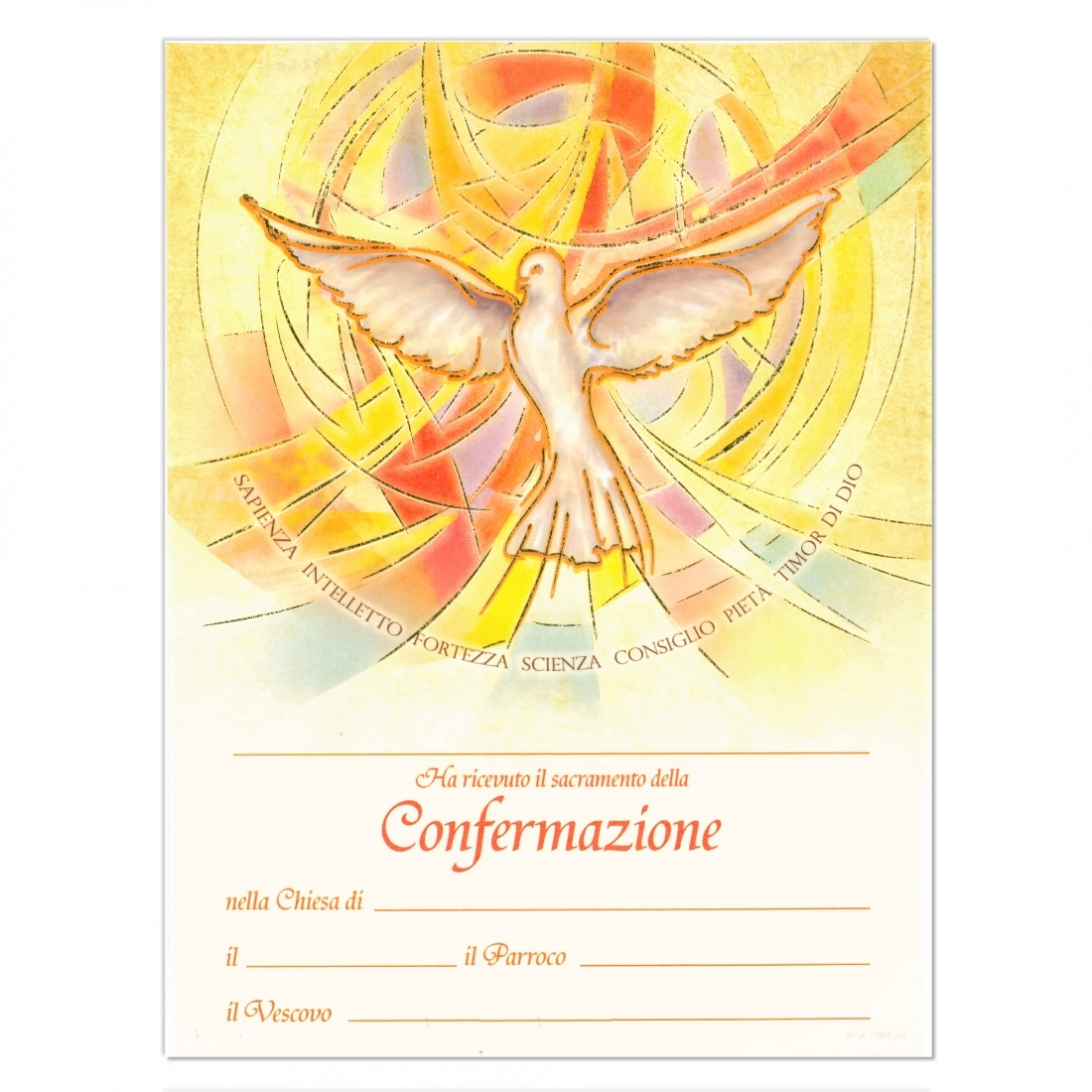 Diploma ricordo per Cresima realizzato in carta pergamena e stampa oro su cui viene raffigurata una colomba stilizzata, simbolo dello Spirito Santo, e indicati i sette doni: la sapienza, l'intelletto, il consiglio, la fortezza, la scienza, la pietà e il timore di Dio