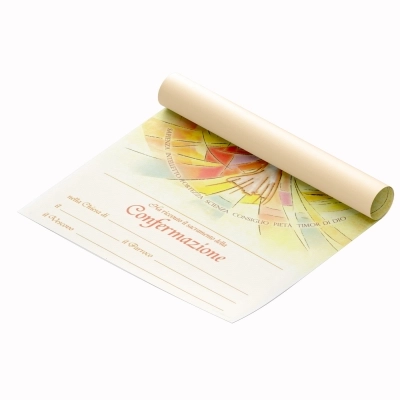 Questa pergamena è personalizzabile con il nome del cresimando, della Chiesa, del parroco e la data della cerimonia.
