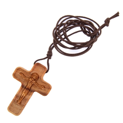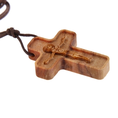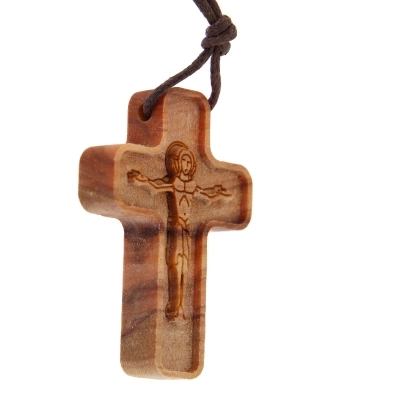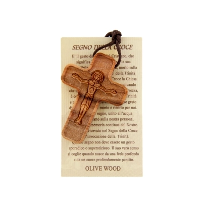 Croce, completa di cordoncino, in legno d'olivo dalle dimensioni 3x3,7 cm, ideale da indossare sempre al collo. Il cordoncino ha una circonferenza di 72 cm. La crocetta ha la raffigurazione del Cristo in rilievo ed è confezionata in bustina trasparente completa di bigliettino con spiegazione del Segno della Croce. Prodotto realizzato in Italia e molto ben rifinito.