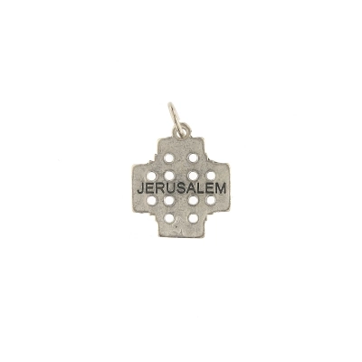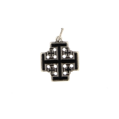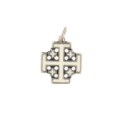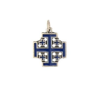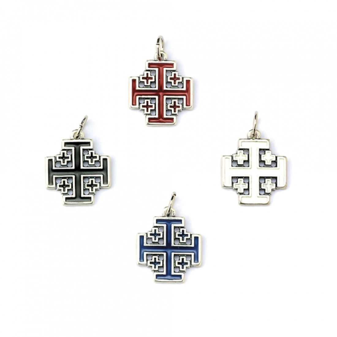 Croce di Gerusalemme in metallo smaltato, dotata di anellino per essere abbinata ad una catenina e indossata al collo. Dimensioni 2x2 cm. Disponibile in 4 varianti di colore: blu, rosso, bianco e nero.