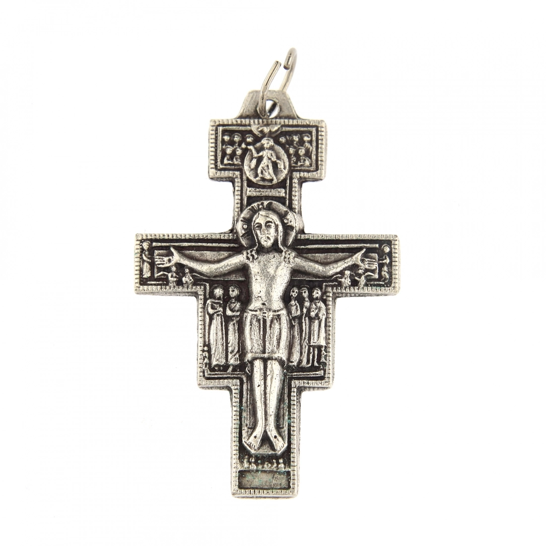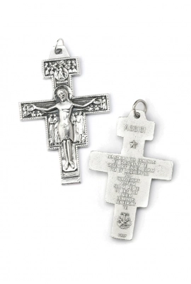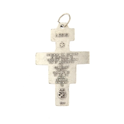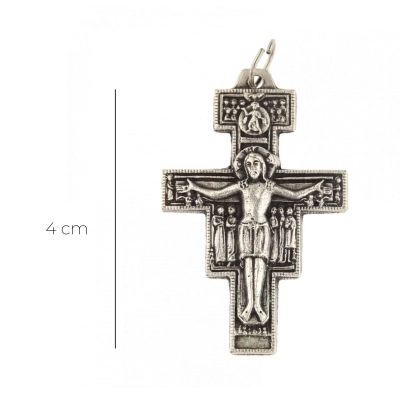 Ciondolo in metallo raffigurante la croce di San Damiano, dalle dimensioni di 2,6x4 cm; dotato di anellino per essere abbinato ad una catenina e indossato al collo. Date le sue dimensioni ridotte, è pratico anche da tenere dentro al portafogli o dentro al portamonete. Realizzata in Italia.
