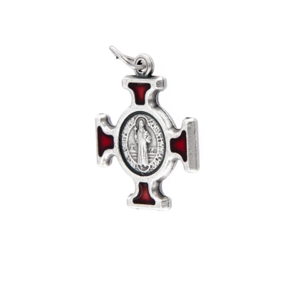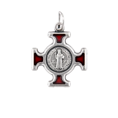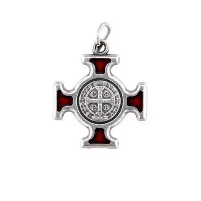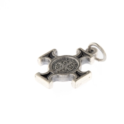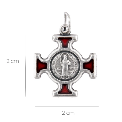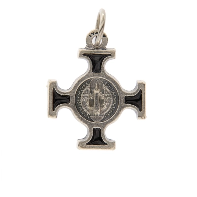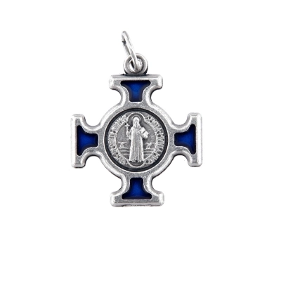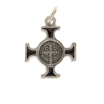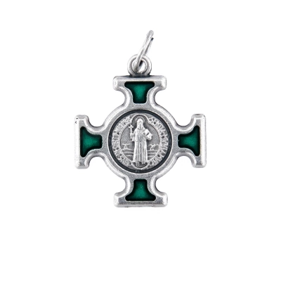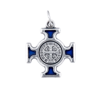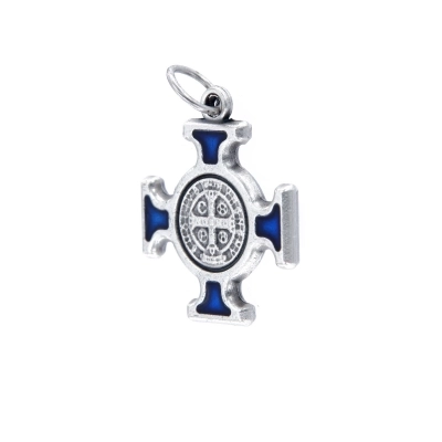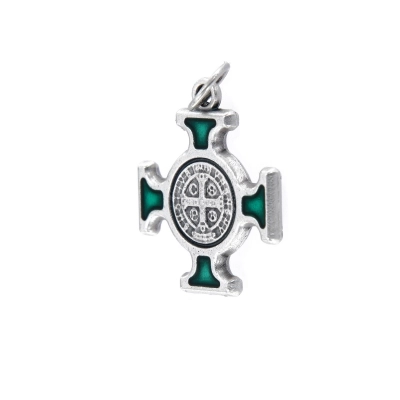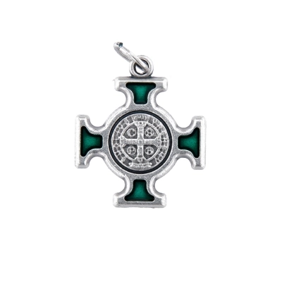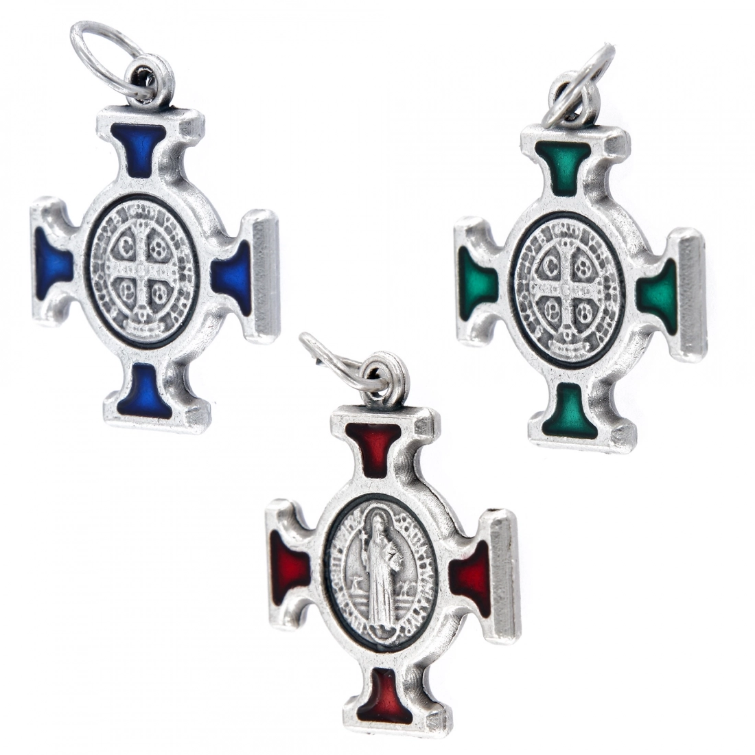 Croce realizzata in metallo con sezioni smaltate colorate e occhiello per l'inserimento di una catenina. Al centro della croce è incastonata la medaglia di San Benedetto. Dimensioni 2x2 cm, disponibile nelle colorazioni: verde, blu e nero.