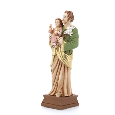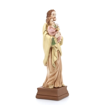 Graziosa e dettagliata statua che raffigura San Giuseppe con in braccio Gesù Bambino. La statua, dai colori brillanti, è adatta da esporre in qualsiasi ambiente domestico.