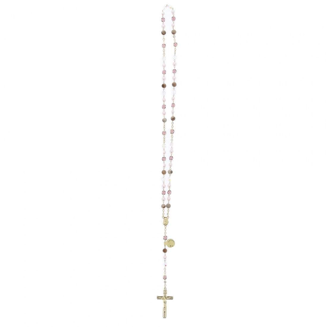 Bellissima corona del Rosario in metallo placcato oro, realizzato con grani di diverso materiale, dalle pietre dure al cristallo e al vetro perlato, tutto con tonalità di colore del rosa, viola e bianco, che la rendono molto fine e delicata. Ideale da regalare in qualsiasi occasione, esempio per la festa della mamma, per donare un prodotto che unisce spiritualità ed eleganza. Sulla crociera è raffigurata la Madonna con Bambino.