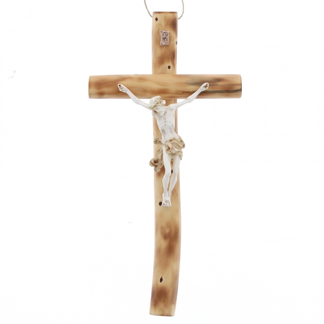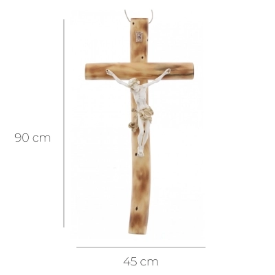 Bellissimo e importante crocifisso in legno di abete e corpo in resina decorata, particolare perchè la croce è stata realizzata e decorata come se fossero due tronchi sovrapposti. Il crocifisso presenta anche un gancio per essere appeso al muro. Realizzato in Italia, da un'azienda artigianale con molta esperienza nella lavorazione del legno.