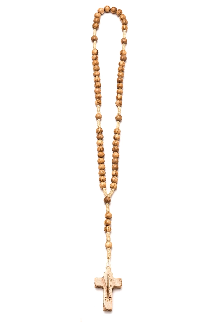 Corona del Rosario in corda e grani in legno d'ulivo di diametro 6 mm. Sulla croce finale, in legno, è raffigurato, in rilievo, il Px che è il monogramma di Cristo, cioè una combinazione di lettere dell'alfabeto greco, che formano un'abbreviazione del nome di Cristo. La corona è molto bella, in quanto tutta interamente realizzata in Italia e in legno d'olivo di alta qualità, lasciato riposare diversi anni prima di essere lavorato, questo per garantire la resistenza dell'oggetto nel tempo.