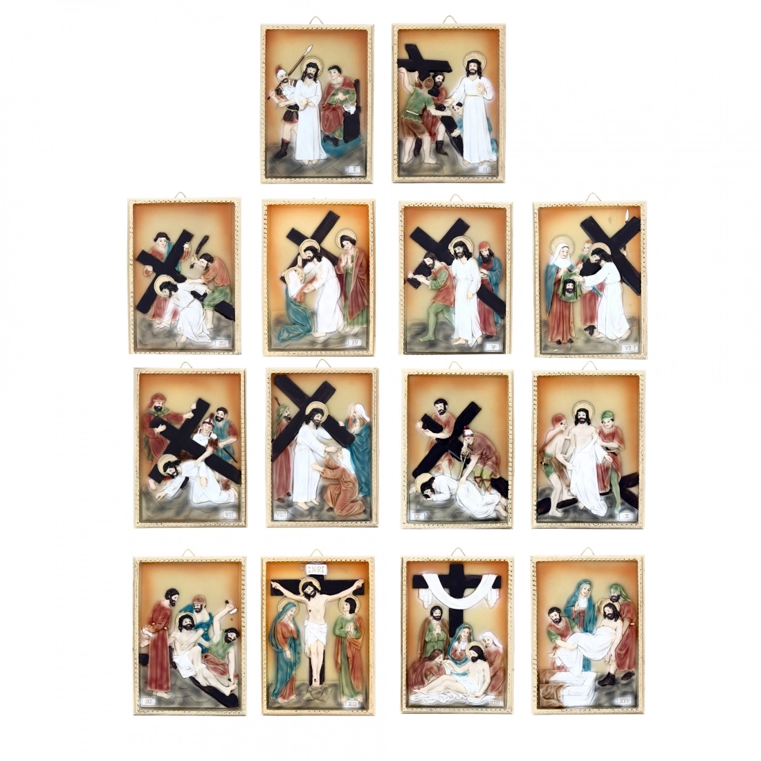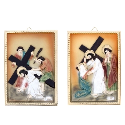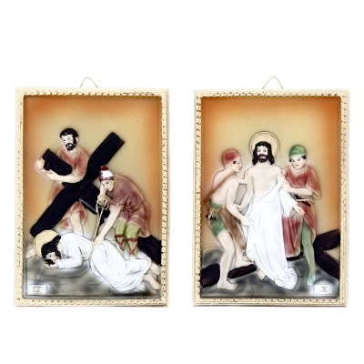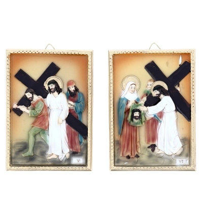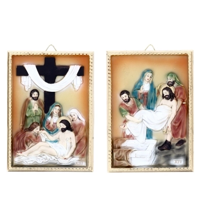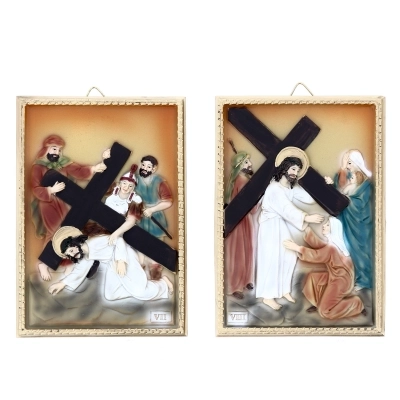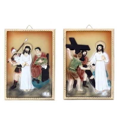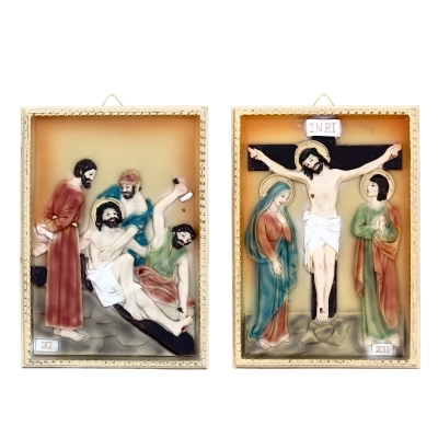 Confezione costituita da 14 quadretti in resina raffiguranti ognuno una Stazione della Via Crucis, con elementi in rilievo. Dai colori tenui, si adatta perfettamente a qualsiasi ambiente sia domestico che sacro. Ogni quadretto è confezionato in una scatolina bianca. La confezione completa di tutti i quadri ha dimensioni 21x38x32 cm.