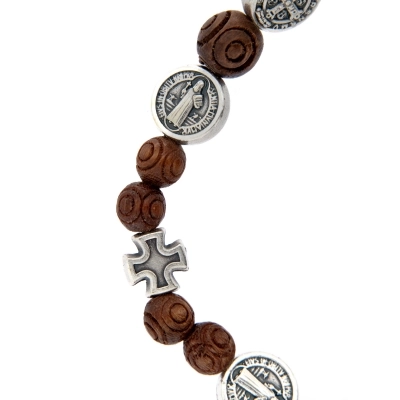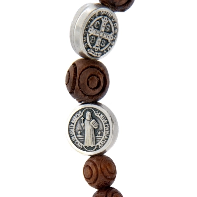 Bracciale elastico composto da 10 medaglie di san Benedetto, con diametro 10 mm, intervallate da grani in legno decorato, di diametro 7 mm. Il bracciale ha anche una piccola crocetta in metallo delle dimensioni di 10x10 mm. Il tutto montanto su un elastico molto resistente e che lo rende adattabile a tutti i polsi. Comodo e pratico da indossare tutti i giorni e utile per poter pregare il Santo Rosario.