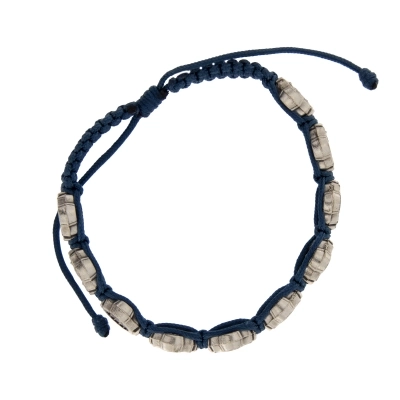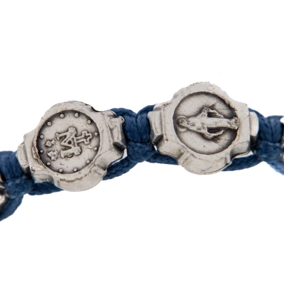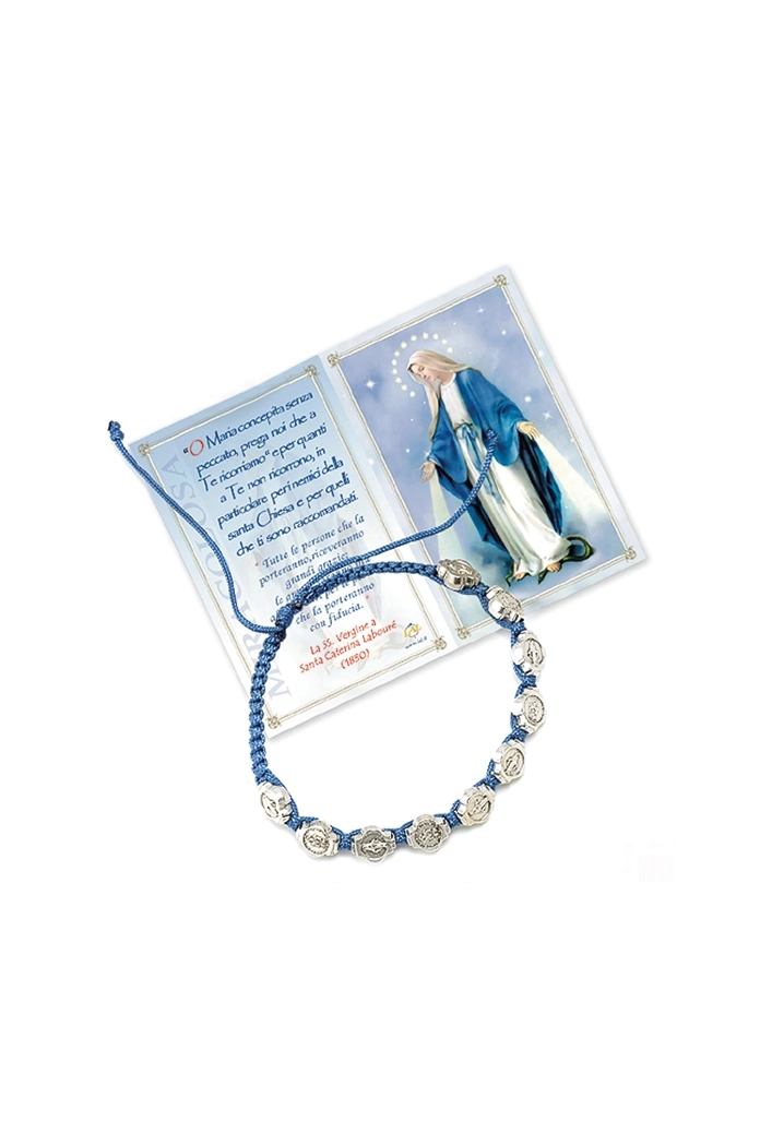 Bracciale in corda azzurra, composto da 10 medaglie Miracolose di diametro 0,8 cm. La corda è regolabile per cui adatto a tutti i polsi. Comodo, pratico e leggero da indossare tutti i giorni, per avere sempre con sè la protezione della Medaglia Miracolosa. Il bracciale è fornito di bustina e santino con la Madonna Miracolosa.