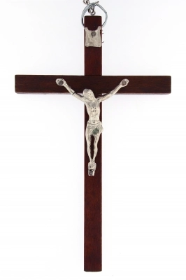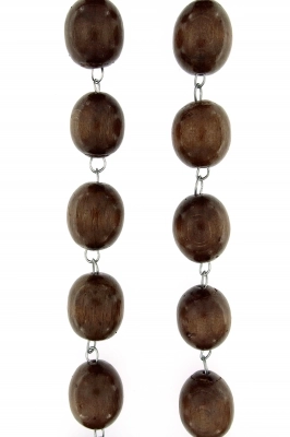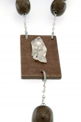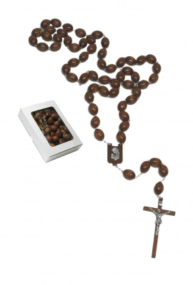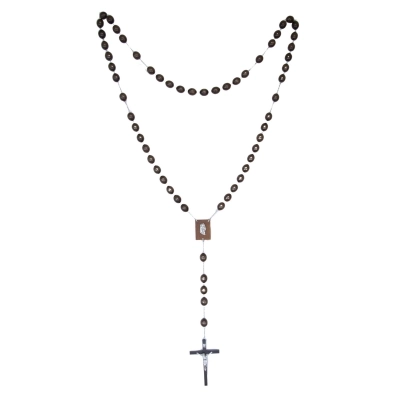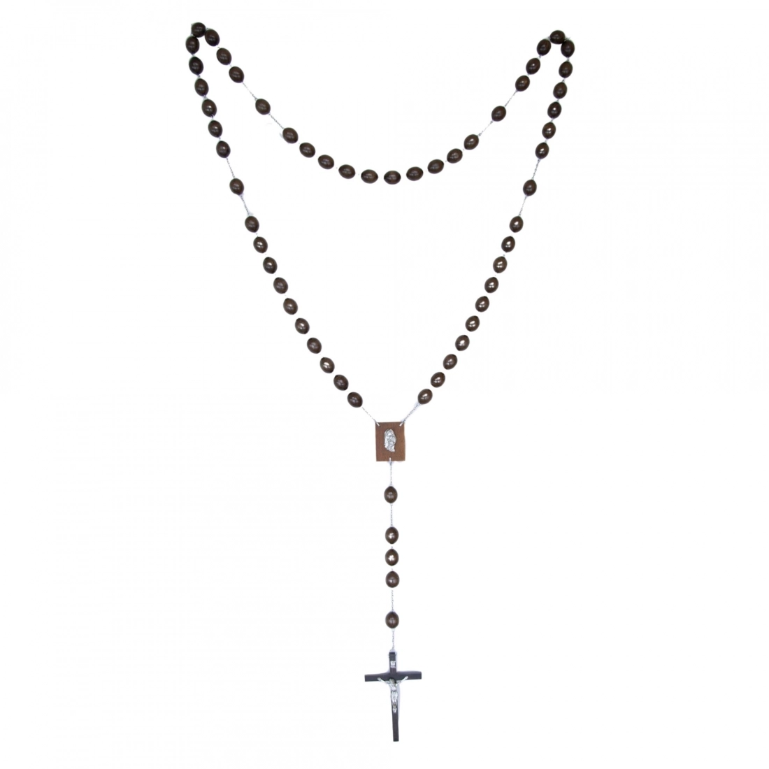 Il rosario è realizzato in legno scuro, montato su catena in metallo. Nella crociera, di dimensioni 5x6 cm, vi è un inserto in metallo rappresentante la Madonna con il Bambino. Anche il crocifisso è in legno con il corpo in metallo. I grani ovali di questo rosario hanno altezza di 27 mm. Articolo realizzato in Italia con legno di ottima qualità.