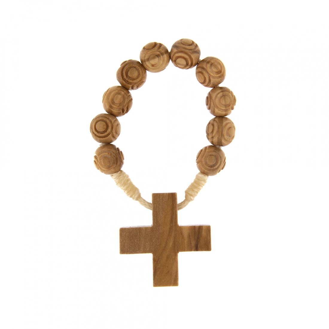 Pratica e comoda per la preghiera, questa decina in legno e corda è ideale per portarla sempre con sé. I grani sono in legno d'ulivo di diametro 7 mm e presentano delle lavorazioni incise. L'articolo è realizzato in Italia con legno d'ulivo di ottima qualità e lasciato riposare diversi anni prima di essere lavorato, questo per garantire la resistenza del prodotto negli anni.