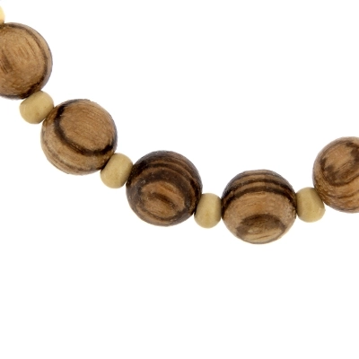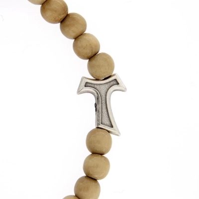 Bracciale elastico composto da 10 grani in legno con diametro 10 mm e colorazione legno naturale con venature più scure, che rappresentano proprio una decina del rosario. Questi sono intervallati da grani più piccoli di diametro 6 mm con colorazione più chiara. IL bracciale ha anche un piccolo Tau in metallo argentato. Il tutto montanto su un elastico molto resistente e che lo rende adattabile a tutti i polsi. Comodo e pratico da indossare tutti i giorni e utile per poter pregare il Santo Rosario. Ideale anche per uomo.