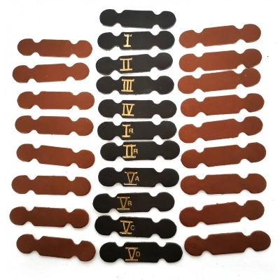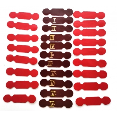 Segnapagine per Messale Romano in pelle: sul fronte stampa in foglia oro dei numeri e lettere dell'Anno Liturgico; sul retro adesivo per applicare agevolmente il segnapagine. La serie contiene 28 pezzi da 1,2x5 cm ed è disponibile nelle varianti rosso e marrone.