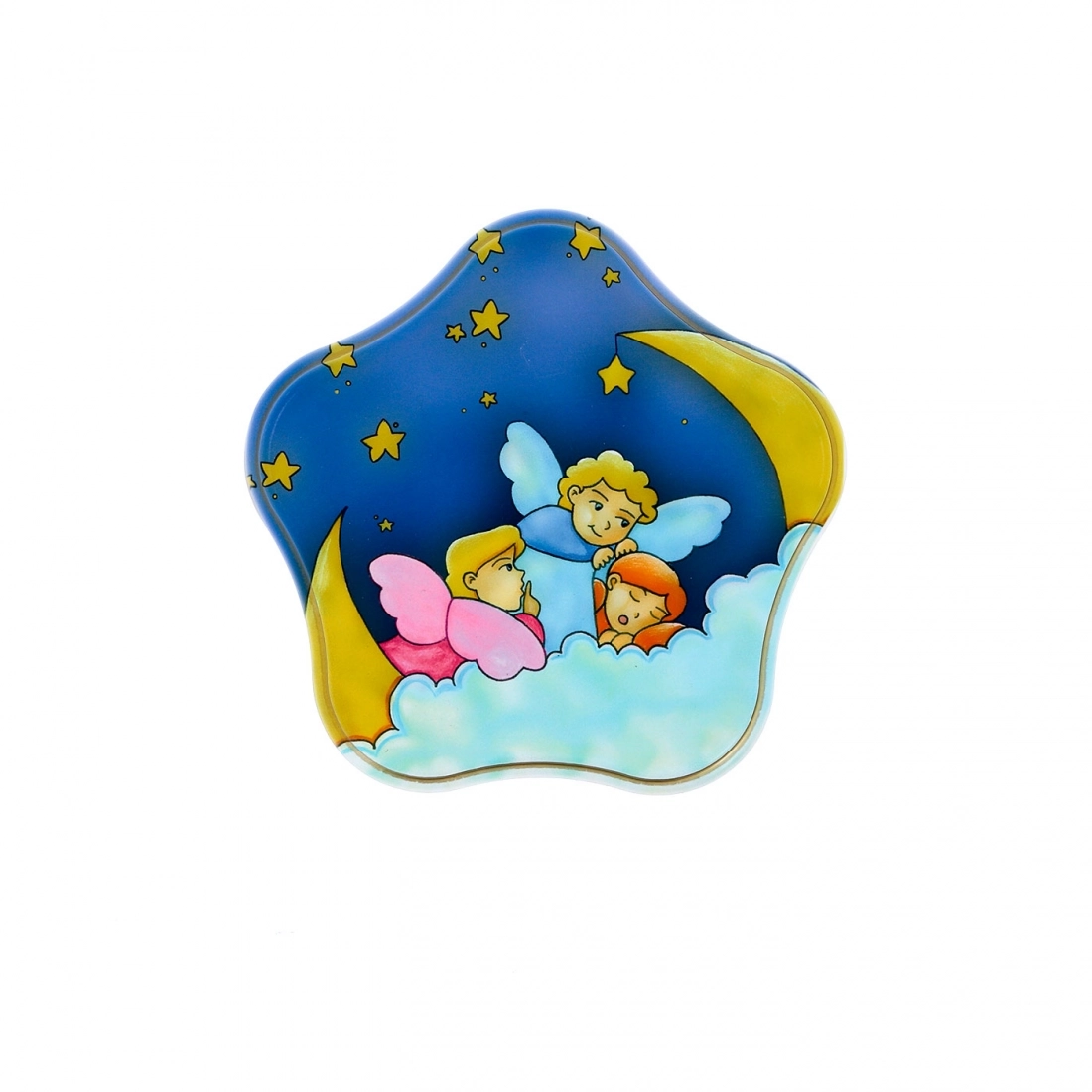 Piccolo quadro a forma di stella realizzato in legno pressato, con foro posteriore per essere appeso o da appoggio grazie alla basetta in dotazione nella confezione. Questo quadretto è decorato con una dolce illustrazione di piccoli angioletti che vegliano un bimbo che dorme. Pensiero molto carino da regalare per una nascita o per un Battesimo, per decorare la cameretta di un bambino.